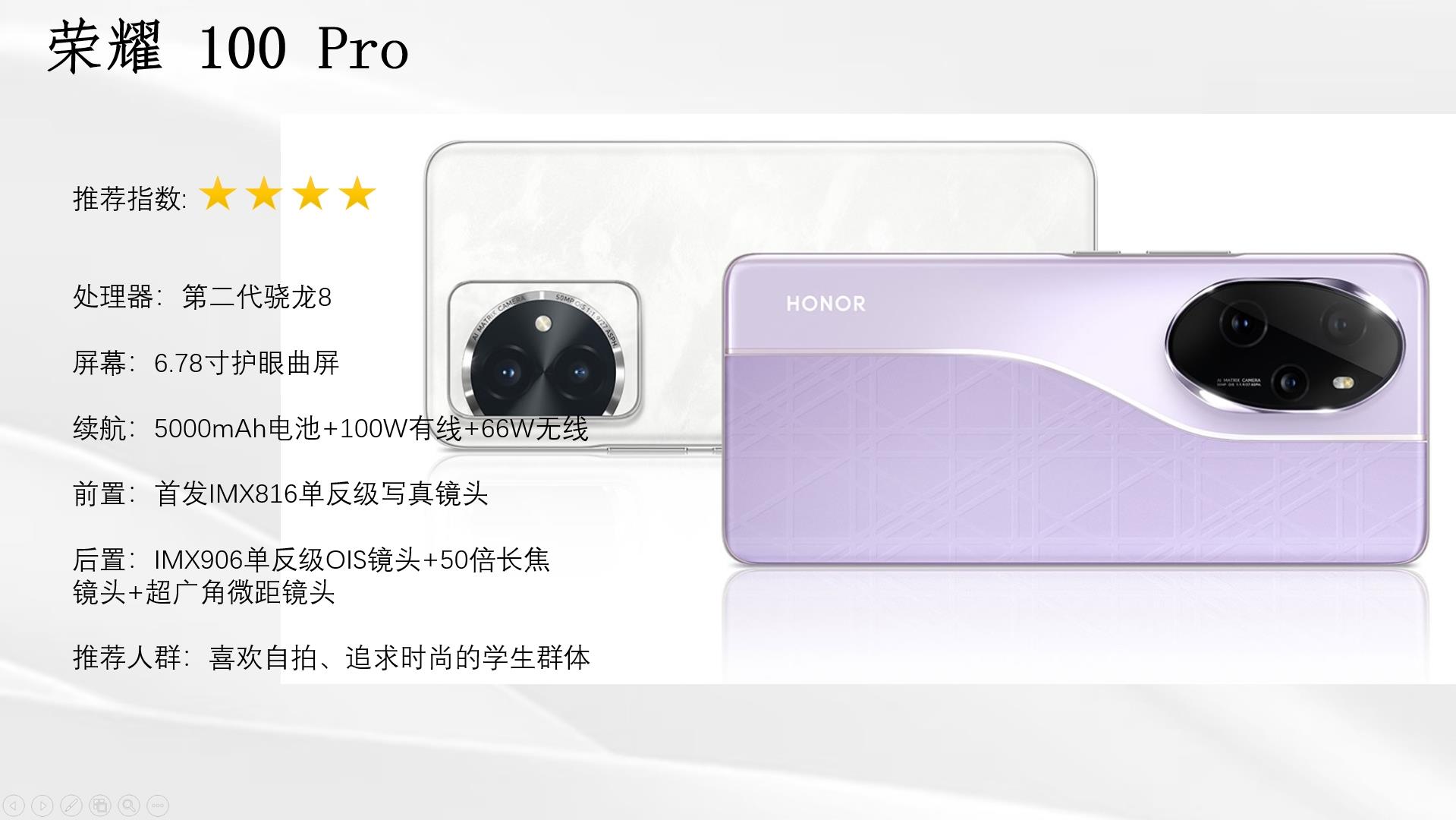 处理器方面并没有选择最新的第三代骁龙8,而是用的上一代的骁龙8G2。不过这颗骁龙8G2也是一代神U了,不管是功耗还是性能方面都是不错的水平。相较于荣耀100.Pro前置升级了首发的索尼IMX816的镜头,后置增加了一颗长焦镜头,拓宽了可玩性。
