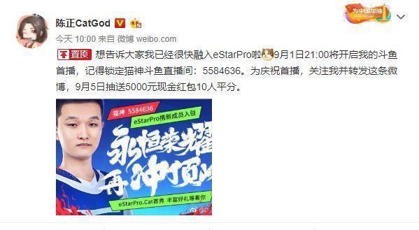 而就在今天也就是9月1号上午十点,eStarPro猫神陈正正就发布了一条微博,宣布今晚九点将会开启斗鱼首秀。并且公布了其在斗鱼的直播房间号。同时,和猫神一起在斗鱼首播的另一位同队选手就是eStarPro兮兮,之前是Hero久竞战队的选手。