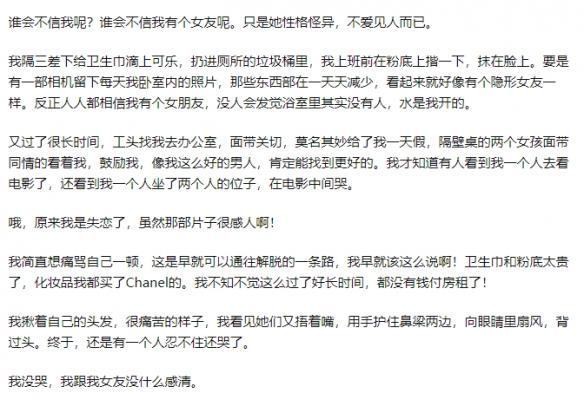 不知道大家有没有看过一篇名为《不存在的女友》的文章(由里八神老师创作),里面的主角为了让别人“以为他有女友”,准备了一大堆化妆品、卫生巾,甚至平常看电影都是买两张票,一个人看。