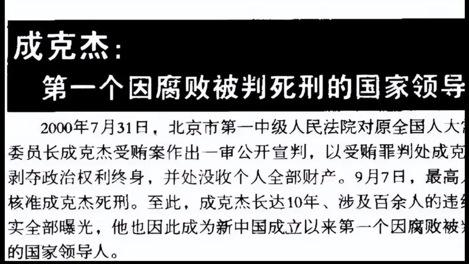 2000年7月31日,北京市第一中级人民法院宣判,以受贿罪判处成克杰死刑,剥夺政治权利终身,并处没收个人全部财产。2000年9月14日,成克杰被执行注射死刑。