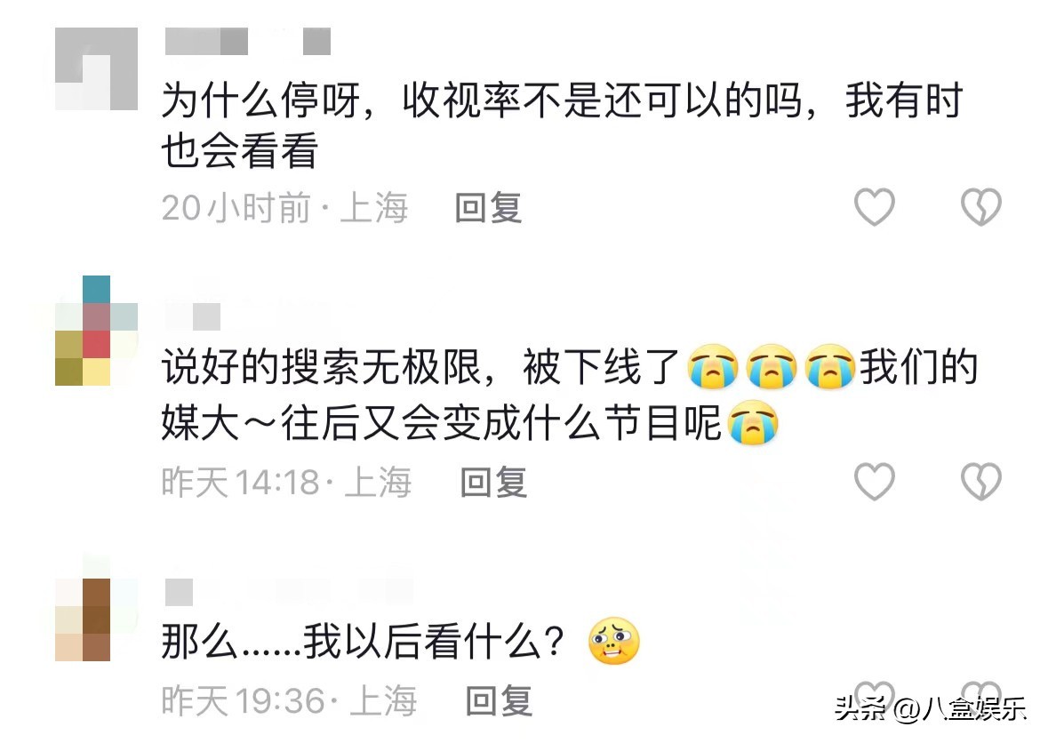 《媒体大搜索》突然停播,也引起了这档节目的观众的不舍。有观众表示,收视率不是还可以吗?为什么要停播了。说好的搜索无极限,被下线了。