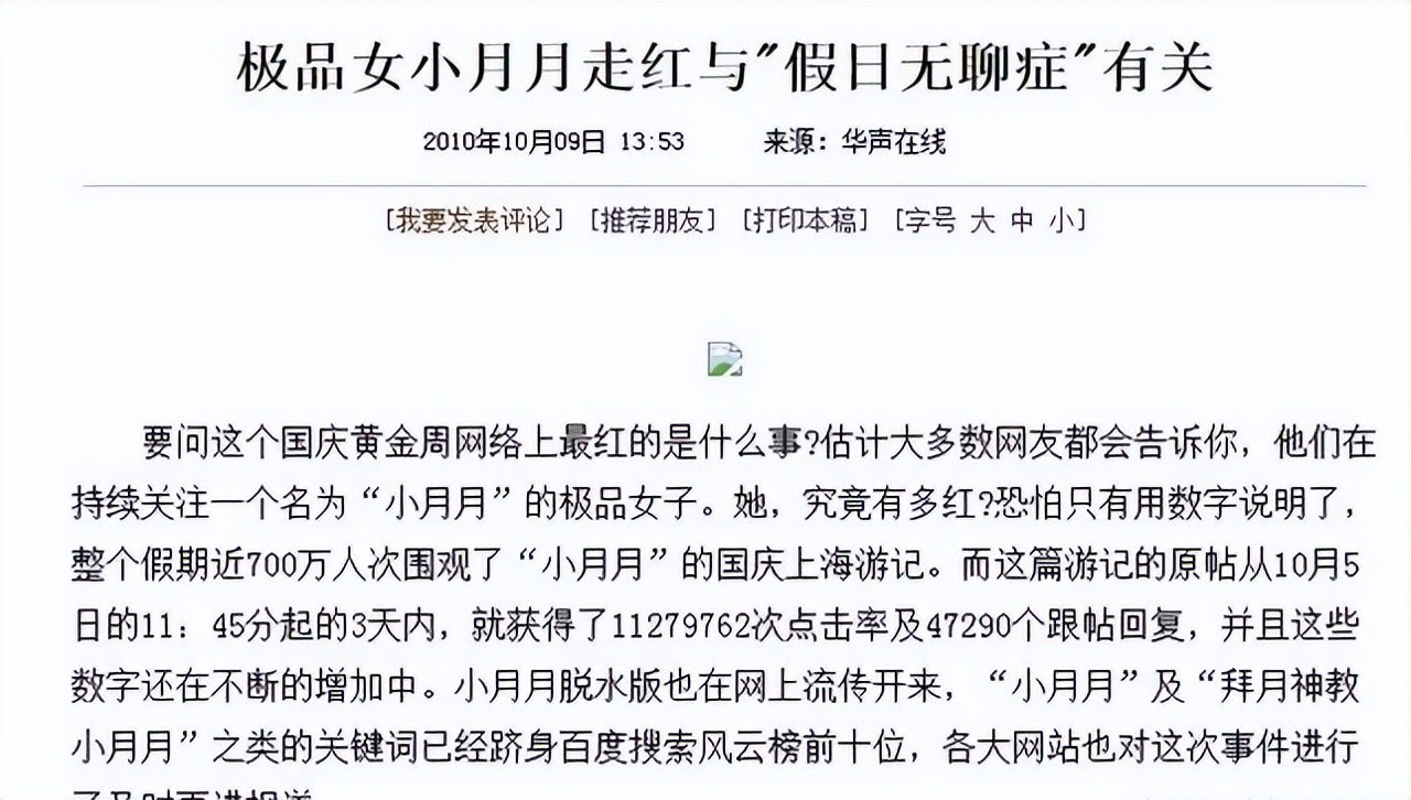 2010年国庆假期,小月月的事儿是从“蓉荣”的一篇帖子开始火起来的。帖子名叫《感谢小月月这样一个极品的朋友给我带来了这样一个悲情的国庆》,发在10月5号,讲的是“蓉荣”在上海接待小月月和小月月男友“小W”的经历。这帖子一出来,就像扔了颗炸弹,迅速炸开了锅。