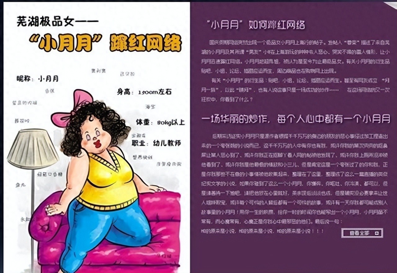 “小月月”这名字听着挺可爱,但她的故事可一点都不温馨。她是“蓉荣”在2010年国庆后发帖里提到的一个人物,据说是安徽芜湖人,职业幼儿园老师,身高150厘米,体重却有160斤,外加一身让人过目不忘的打扮,比如紧身粉色连衣裙或者花里胡哨的裤子,手里还总攥着一块老掉牙的砖头手机。这个形象,光想想就够抢眼了。