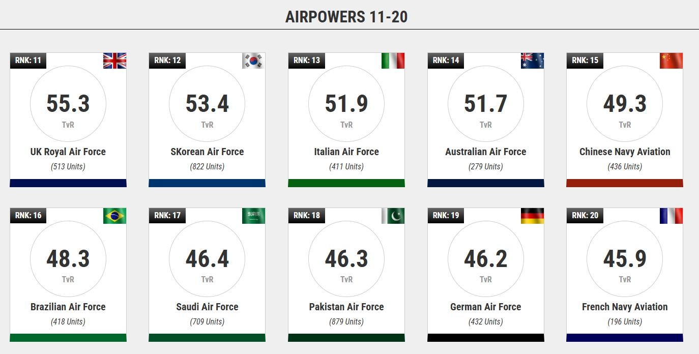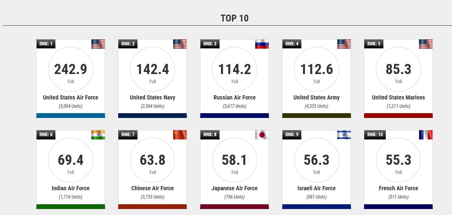 美国空军:5,004架飞机,TVR得分242.9。美国海军:2,504架飞机,TVR得分142.4。俄罗斯空军:3,677架飞机,TVR得分114.2。美国陆军:4,333架飞机,TVR得分112.6。美国海军陆战队:1,211架飞机,TVR得分85.3。印度空军:1,716架飞机,TVR得分69.4。中国空军:3,733架飞机,TVR得分63.8。日本空中自卫队:756架飞机,TVR得分58.1。以色列空军:581架飞机,TVR得分56.3。法国空军:511架飞机,TVR得分55.3。