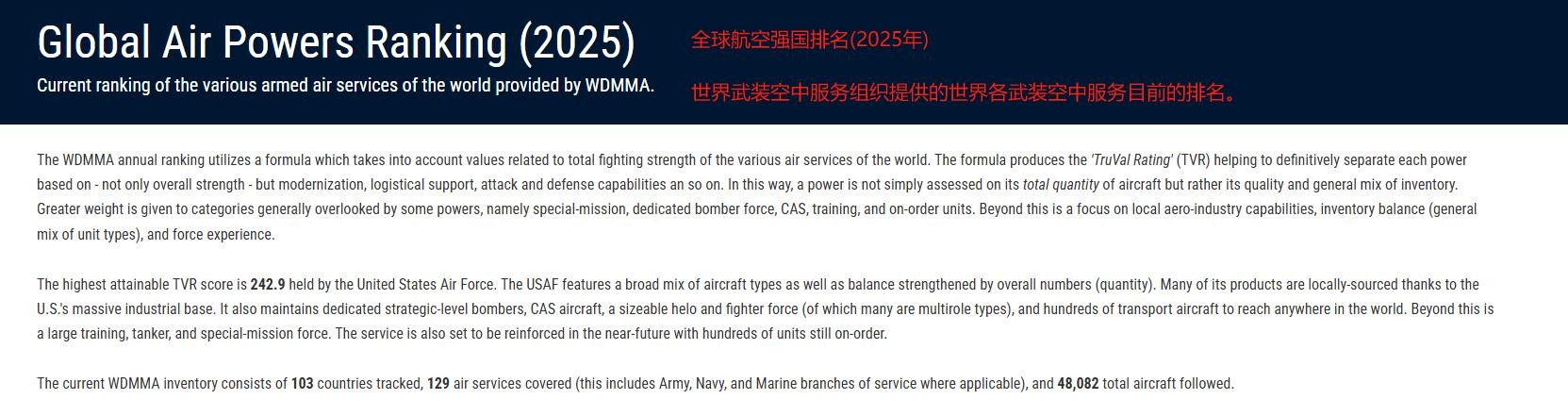 近日,美媒WDMMA(世界现代军用航空目录)公布了2025年全球空军力量排名,该排名评估了全球103个国家的129个空中力量单位,涵盖了48,082架飞机。这个排名比较有意思,前十的空中力量如下: