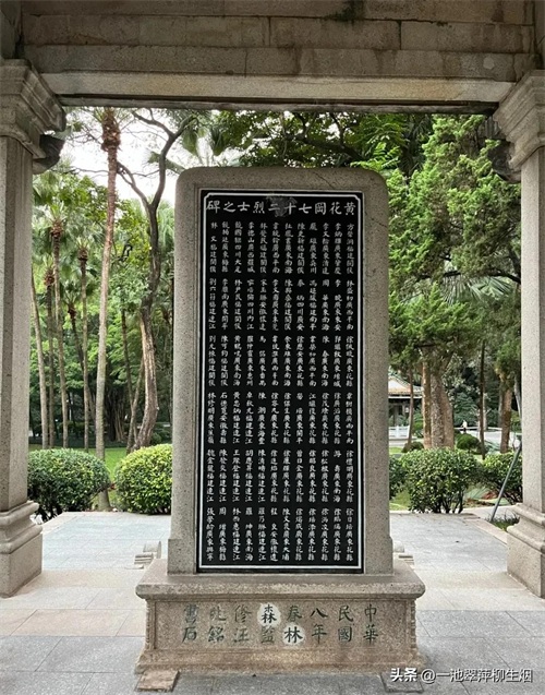 黄花岗七十二烈士碑记亭,亭中伫立着一块烈士碑,上面镌刻着黄花岗起义中牺牲七十二烈士的名字和籍贯,林森监修,汪兆铭书。