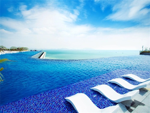 康年酒店,2018年开业。地处三亚湾核心地段,与美丽的西岛隔海相望。酒店距离机场、天涯海角都很近。网红空中无边泳池与蔚蓝的大海融为一体,非常出片。你甚至还可以不出酒店就可以和椰梦长廊的夕阳来一场美丽的邂逅。
