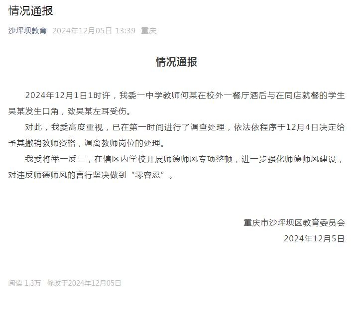 与此同时,重庆市沙坪坝区教育委员会也发布情况通报: