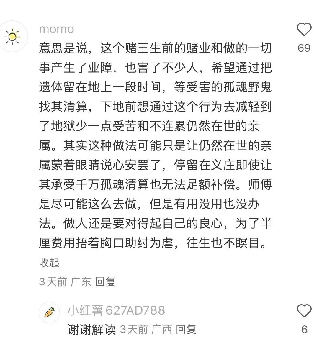 “赌王遗体放在义庄一年时间,接受这种业障的循环,然后将它化解掉,这样才能让他有来生,让事情变得圆满,最重要是能够帮助他的后人,让他的后人能够平静生活。”