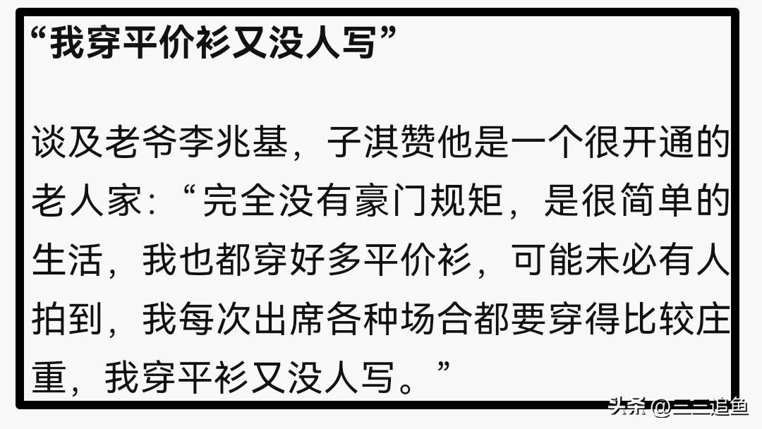 她不仅外表好看,谈吐也很自然,她曾坦言豪门只是标签,家里只有公公李兆基有名气,自己住的房子很舒适,并表示自己是普通家庭,还会调侃自己平时也会穿平价的衣服,只是没被拍到,其实平时也很随意,只有出席大型活动才会穿的隆重华贵一些。