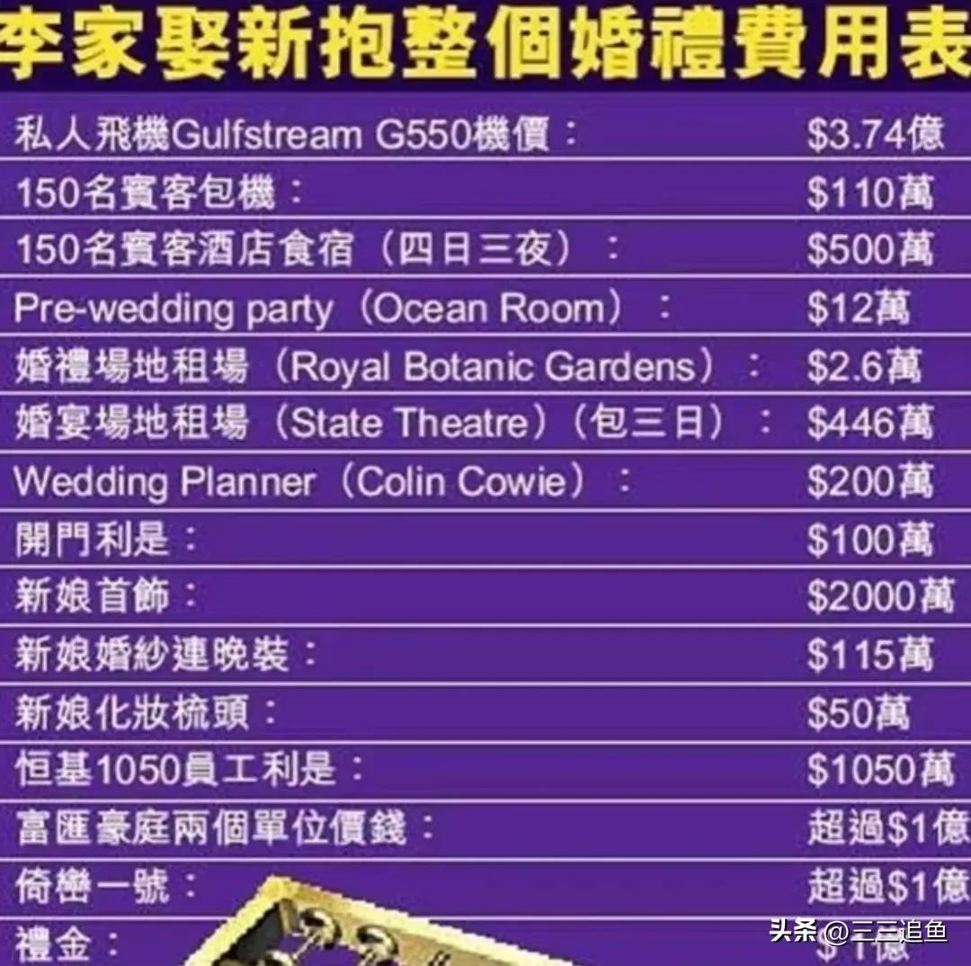 俩人的婚礼花费高达7亿,李兆基直接赠送儿媳游艇、豪宅、地皮,超过十亿。