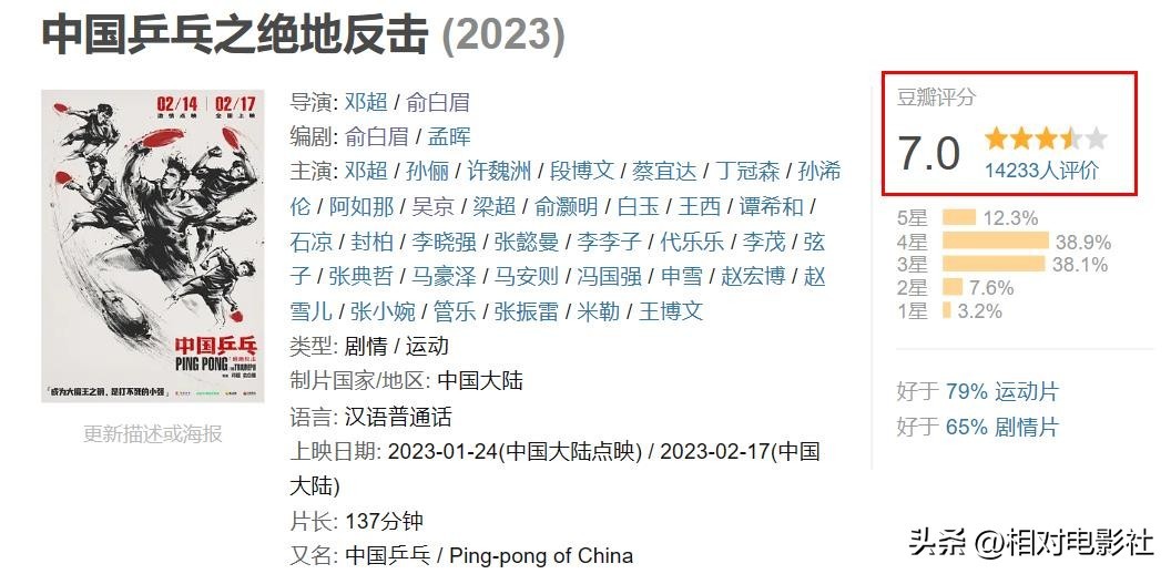 当前豆瓣7.0的中上评分,可谓暂时位列邓超、俞白眉联合执导电影之中,评分最高作品。