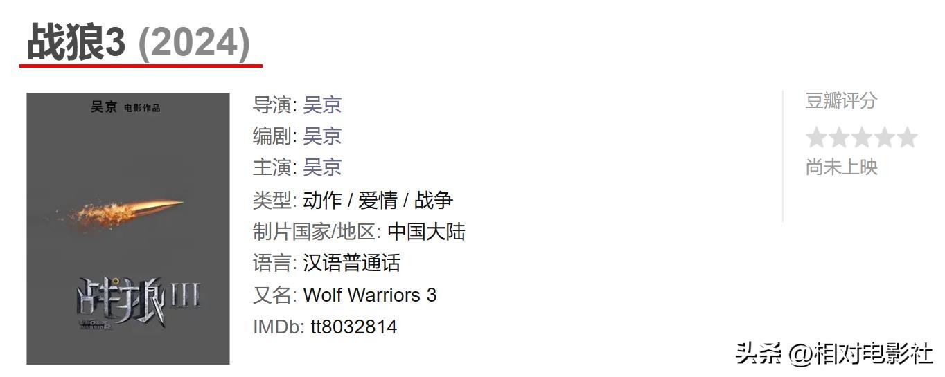 另外,需要补充的是,根据豆瓣显示,被万众期待、而且距离2017年票房王者《战狼2》,已过去将近6年时间的全新续集——《战狼3》,若是想要在2024年,与观众见面的话,那么在今年,就必须要开始着手进行拍摄。因此,我们姑且等待吴京,接下来会如何安排。