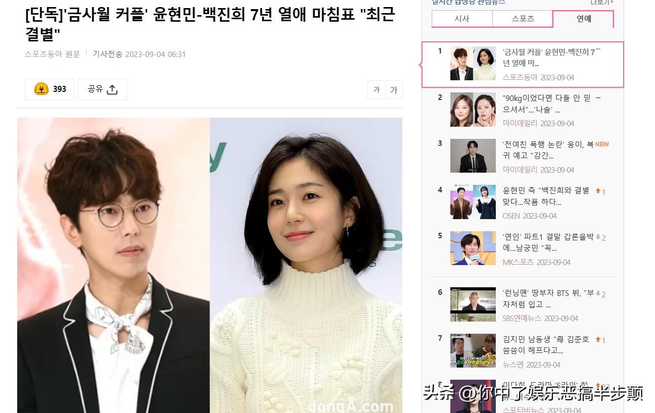 9月4日,交往7年的韩国男演员尹贤敏和女演员白珍熙通过双方所属经纪公司对外官宣分手!