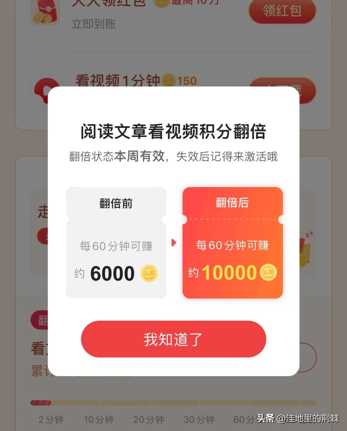 头条极速版任务的翻倍按钮可以使金币翻倍,知道这个是因为我经常忘记点击翻倍按钮,因为这个每周一更新一次,需要手动操作,但一般情况我习惯于打开头条就开始刷金币,等刷十几二十分钟才会去点击任务栏,这就亏了一波,不要小看几千金币,堆积起来就不少了。
