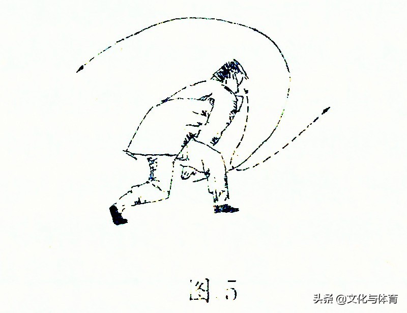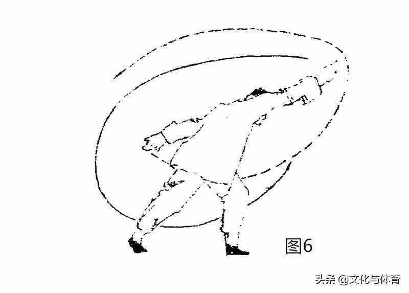 1,上动不停,上体抬起,带动右手臂前挑,左手臂后伸、两手臂呈斜平,眼视右手方向(图6)。