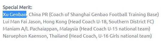 徐根宝为中国足球做出的努力,得到了亚足联的认可与回馈。而这次与他一同获得该奖项的还有三人,分别为中国香港U18教练吕文辉、马来西亚U15主教练帕差亚潘、泰国U16女足主教练基恩森。
