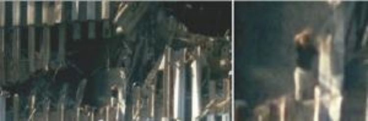 18.在这张照片中,你可以看到在911当天有一个女人悬挂在新世贸大楼壁架上挥手求救。最离奇的是她生还了,没有人知道她是怎么逃出新世贸大楼中却没有死掉的。