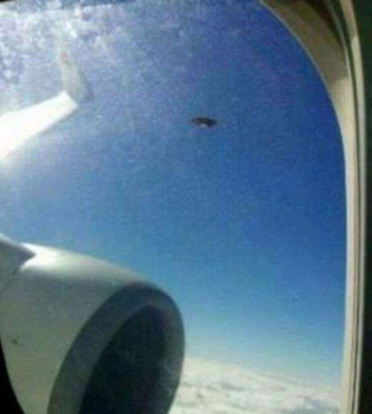 1.该张照片是从飞机内部往外拍的,其中有一个奇怪又诡异的物体飘浮在飞机旁边。由于该物体的碟状外型和其他特征,很多人觉得这可能是UFO。