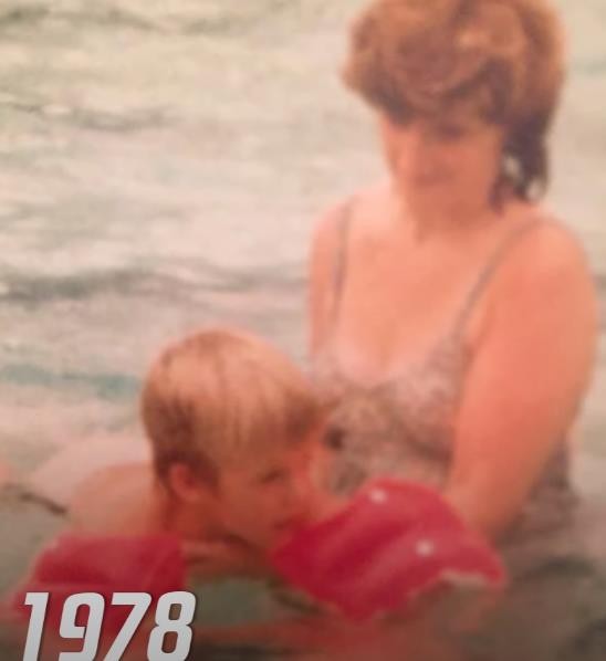 1978年的小贝,在母亲的怀抱里游泳,照片虽然模糊了,但是对他对于喜欢他的球迷也算是珍贵的留念,母亲桑德拉·韦斯特是一名美容师。