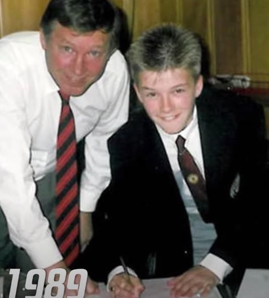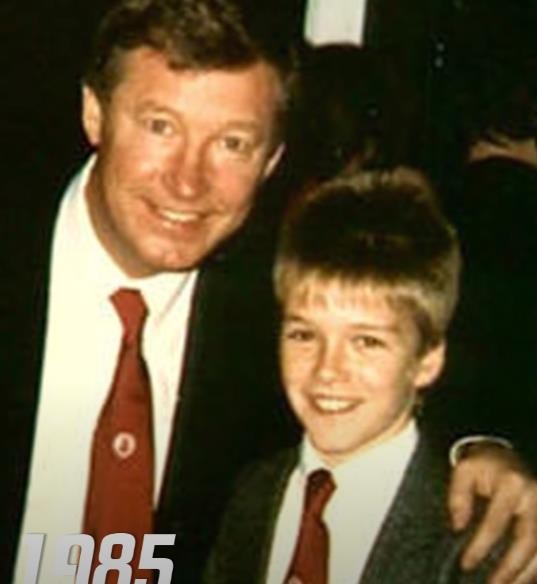 1985年贝克汉姆未来的主教练弗格森与小贝的合影。