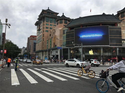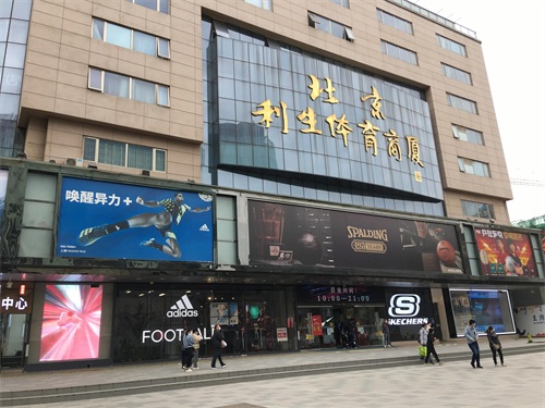 这是王府商厦,砖红色条状的建筑装饰风格彰显恢宏大气,引人瞩目。从两侧整齐的招牌可以看出这里云集众多商家。