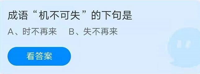 支付宝蚂蚁庄园小课堂5月21日的其中一个问题是:成语机不可失的下句是?这个问题考察大家的成语知识,下面一起来看一下蚂蚁庄园5月21日的正确答案吧。