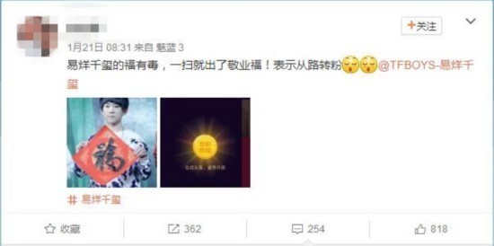 近日,支付宝再次推出了“五福红包”活动,表示要“把欠大家的敬业福都还给大家”。网友们纷纷搜索带有“福”字的图片扫福,但敬业福依旧是稀缺资源。很多网友通过扫易烊千玺的书法福字成功扫到敬业福,大喊“路转粉”。粉丝表示:“这个入坑理由很意外了。”