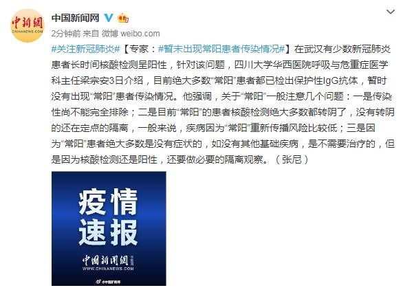 在武汉有少数新冠肺炎患者长时间核酸检测呈阳性,针对该问题,四川大学华西医院呼吸与危重症医学科主任梁宗安3日介绍,目前绝大多数“常阳”患者都已检出保护性IgG抗体,暂时没有出现“常阳”患者传染情况。他强调,关于“常阳”一般注意几个问题:一是传染性尚不能完全排除;二是目前“常阳”的患者核酸检测绝大多数都转阴了,没有转阴的还在定点的隔离,一般来说,疾病因为“常阳”重新传播风险比较低;三是因为“常阳”患者绝大多数是没有症状的,如没有其他基础疾病,是不需要治疗的,但是因为核酸检测还是阳性,还要做必要的隔离观察。(张尼)