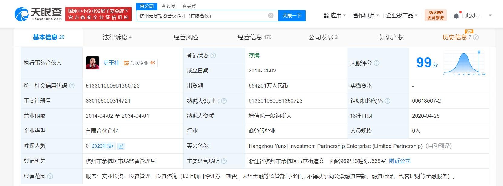 杭州云溪投资合伙企业(有限合伙)成立于2014年4月,执行事务合伙人为史玉柱,出资额约65.4亿人民币,由杭州凯锐文化传媒有限公司、史玉柱、杭州云煌投资管理有限公司共同出资。值得注意的是,史玉柱持有的该企业股权已多次被冻结。