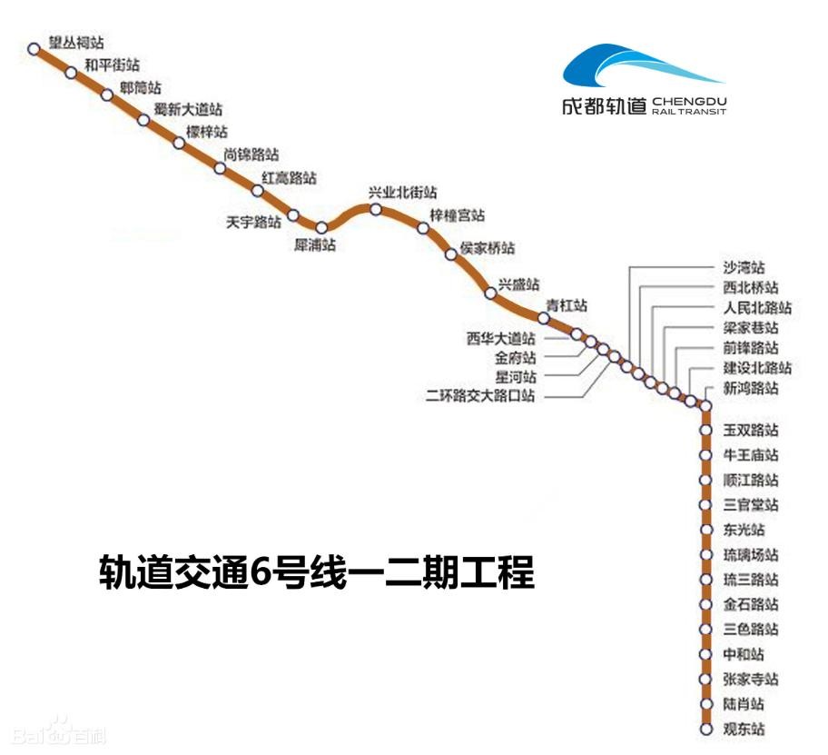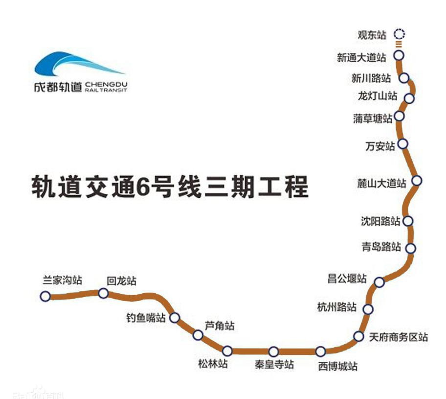 成都地铁6号线于2016年9月30日开工建设一、二期工程(望丛祠站至观东站),于2017年2月27日开工建设三期工程(观东站至兰家沟站),预计一、二、三期工程将于2020年年底建成通车,标志色为棕色。