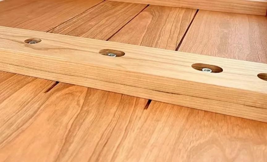 如果不是开槽穿榫,也可以用螺丝+木条的结构,原理和作用是一样的,但螺丝孔要开大一些,然后给螺丝加个垫片,这样木材热胀冷缩时,螺丝可以随之产生位移,不至于硬挤木材。