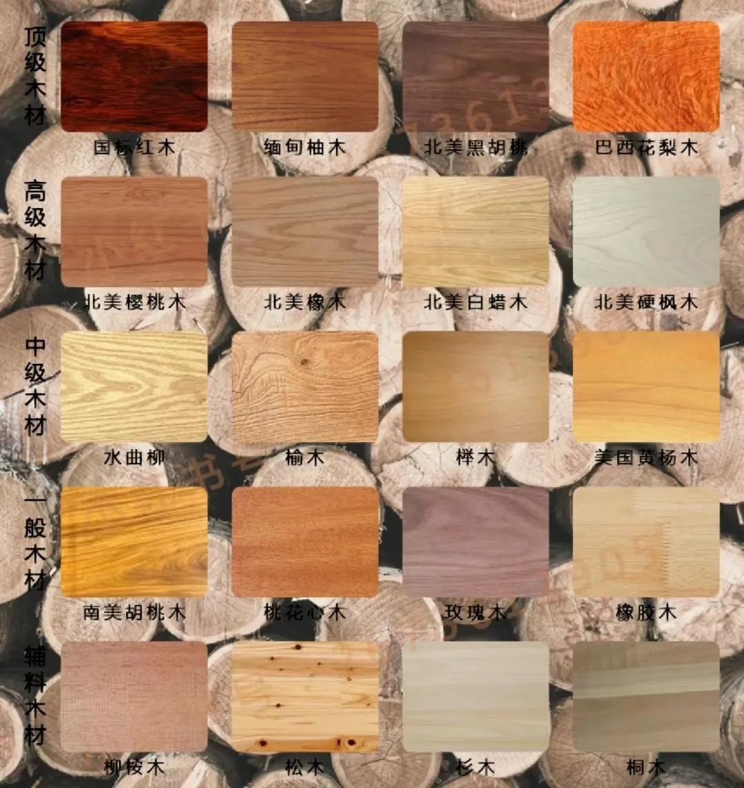 常见的:松木、橡胶木、水曲柳、榆木、红花梨、红玫瑰、红胡桃、胡桃木、海棠木、桃花心木、白蜡木、红橡木、樱桃木、黑胡桃木等等,每种的颜色、花色、价格都不同。