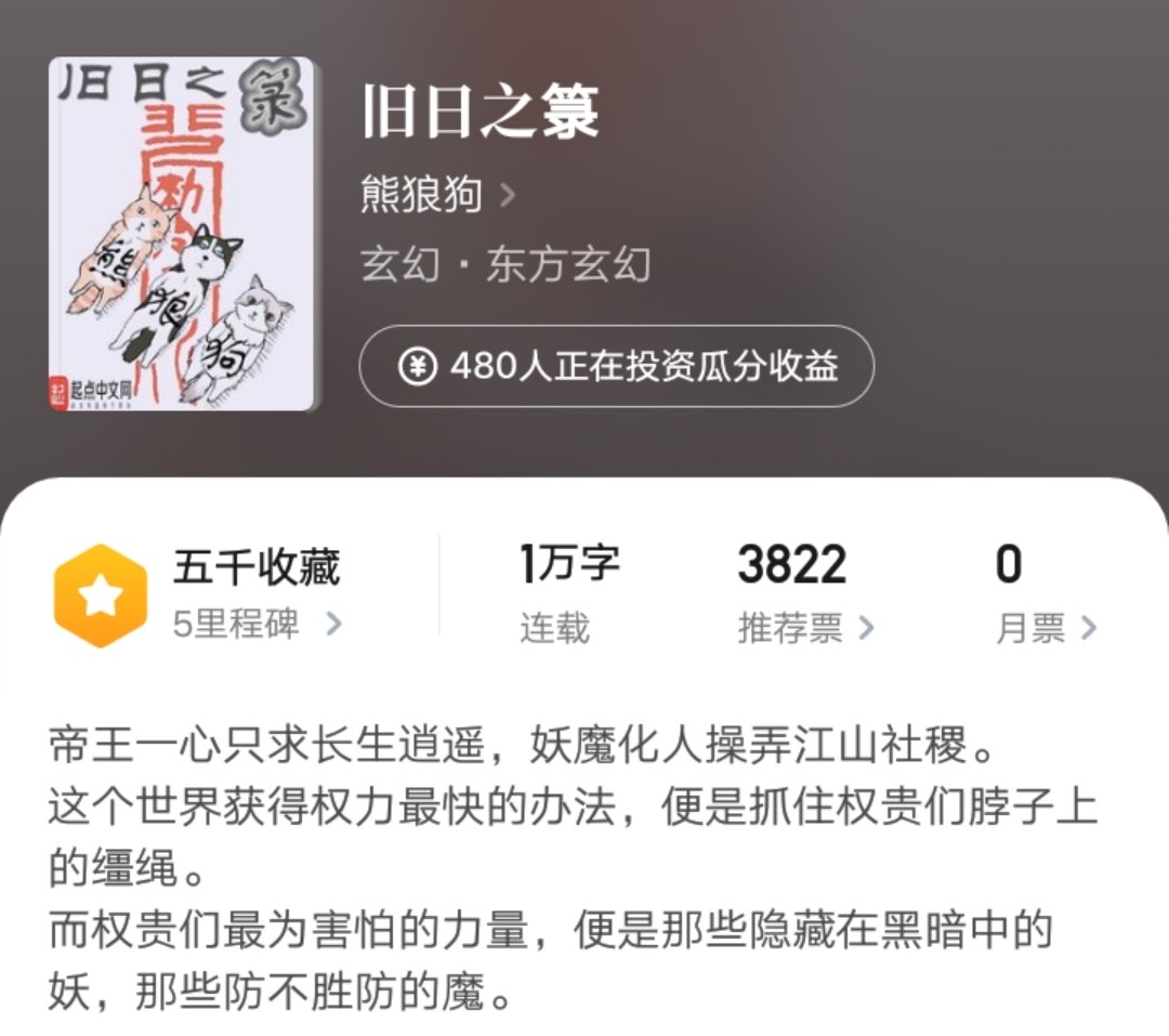 同样是隔了四个多月,今年的新晋玄幻大神熊狼狗开新书了。书名《旧日之箓》,讲述一个现代人穿越到武力超凡的古代社会如何生存的故事。