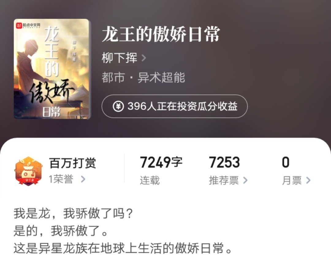 这本新书是他写给儿子的短篇小说,大家随意看看即可。除了这本新书,他另有一本历史题材新书《大唐第一世家》正在连载。预计国庆就上架了,到时候大家可以去支持一下。