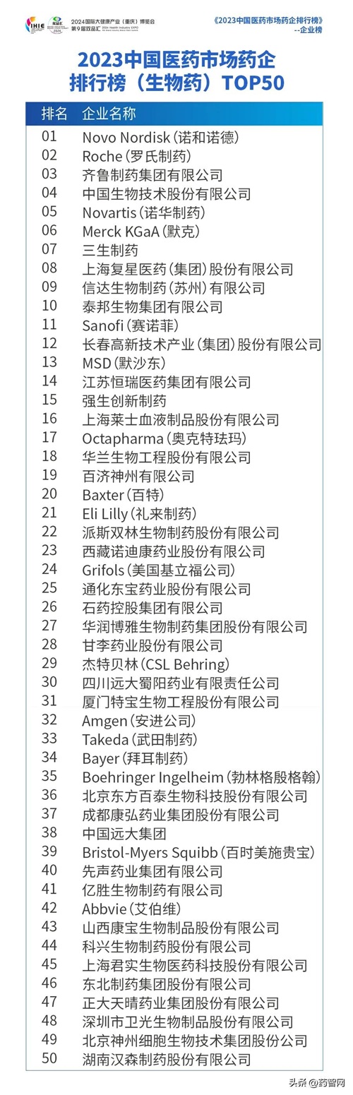 生物药榜:仅统计企业的生物药(生物制品)在医疗机构和药店的销售额,再根据销售额进行企业排名。