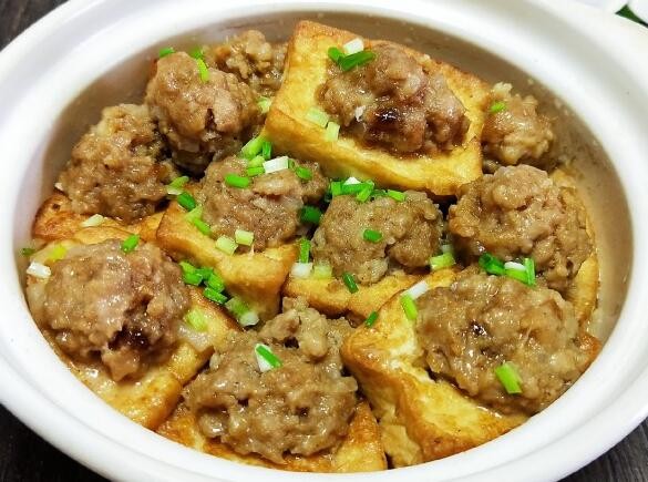 食材:豆腐、猪肉、香菇、洋葱、鸡蛋、盐、生抽、蚝油、沙茶酱、胡椒粉、淀粉、鸡精、香油