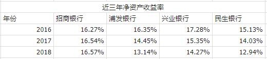 通过近三年这四家股份制银行的净资产收益率对比,很容发现,招商银行的净资产收益率相对稳定,且一直维持在一个相对较高的水平,其中兴业银行虽然在2016年达到了17.28%的高水平,但以后两年都呈下降趋势。