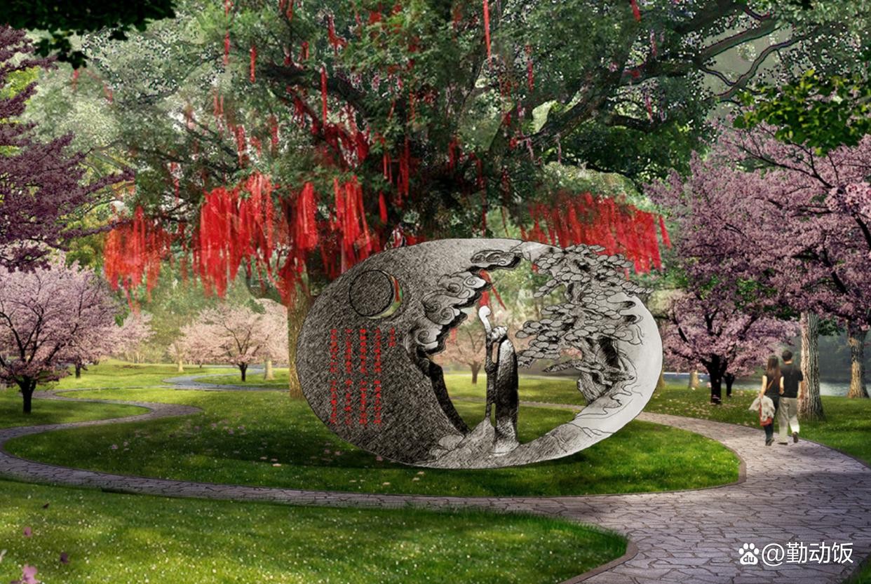 月老石也被称为“月老初心”,位于鹊桥仙东北方向,处于公园东部。月老是中国民间传说中主管婚姻的红喜神,也是天庭的一位神仙。月老石雕塑整体造型以椭圆形自然景石镂空雕刻而成,通过提炼“月下老人”“桂树”等经典元素,以具象及写意的手法对雕塑进行刻画。