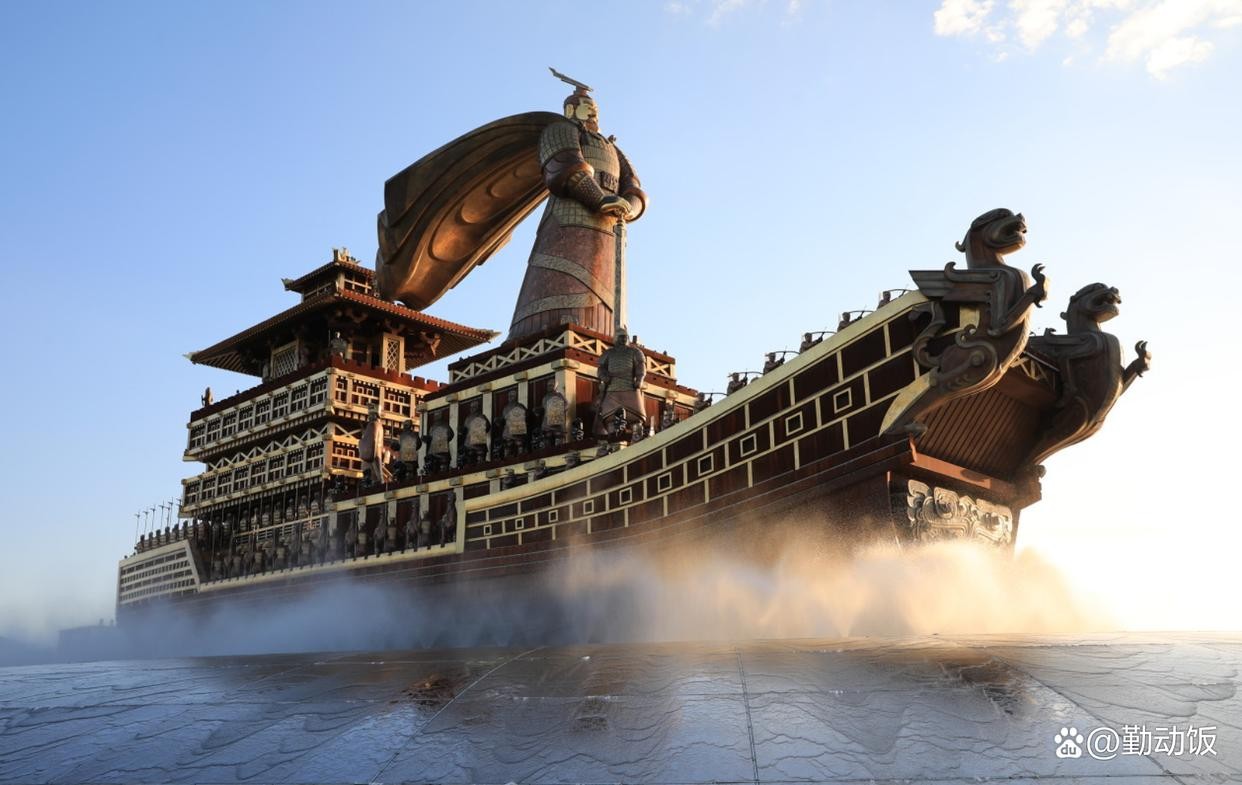 汉武楼船位于七夕公园景区入口以南,处于公园西北部的云汉广场中心,被称为七夕公园的标志性建筑之一。汉武楼船因巨大的甲板和小楼一样的外观而得名,楼船是西汉时期水军的主力战舰之一,也被称为“古代航空母舰”。汉武楼船周围是八个方向的士兵,甲板下有舱室保护士兵划桨,甲板上则可以进行接舷战,甲板上设多层建筑,从下至上分别为,庐、飞庐、爵室,周围设有防护墙;甲板的前方为身披金甲汉武帝刘彻,文臣、武将、士兵,车马环绕在其身旁。