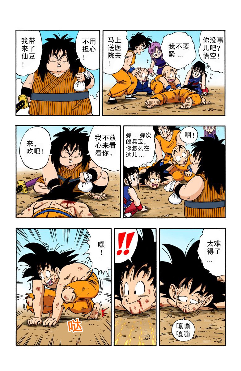 之后,弥次郎与前来寻找龙珠的比克大魔王之子铜钹激战,一招拔刀术就将铜钹斩成三段,并且烤熟吃了个精光,打起了武装反抗大魔王的第一刀,此外还有一个细节,弥次郎兵卫识得比克大魔王的名头,证明他见多识广(年轻一辈的天津饭、雅木茶全部没听说过比克)。