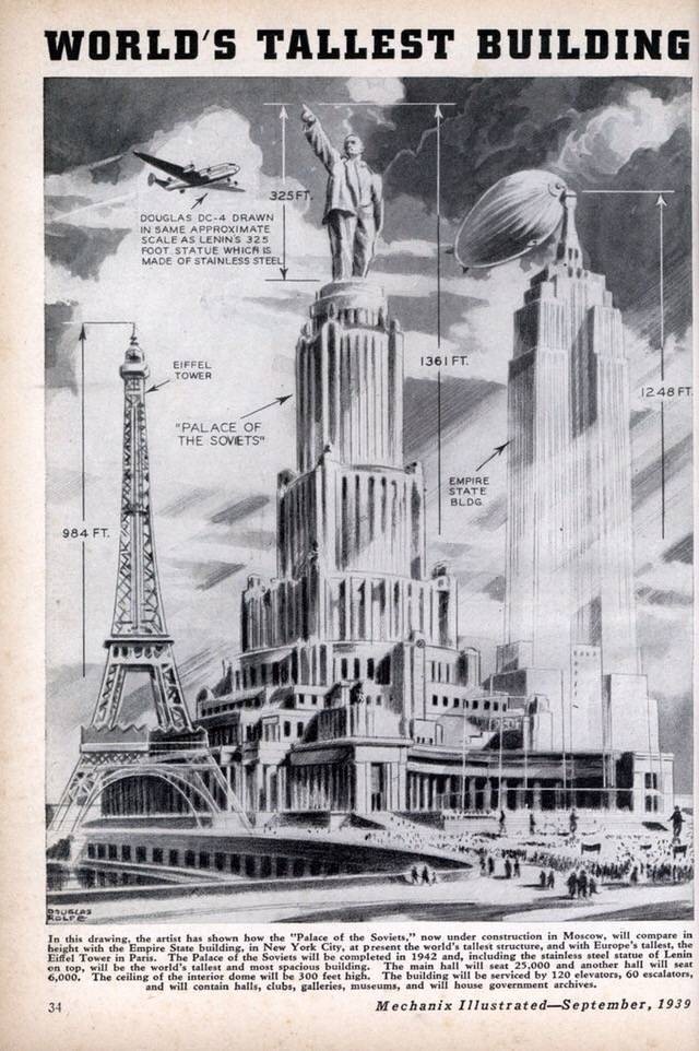 苏维埃宫Palace of the Soviets (俄语: Дворец Советов)是苏联在1930年代所计划建造的一座公共建筑,用以纪念革命导师列宁,以及用作国家议会和政治机关。如果建成,这座伫立在莫斯科河畔的建筑将成为当时世界上最高的单体建筑,高430m. 比巴黎埃菲尔铁塔高95米,比纽约帝国大厦高8米。