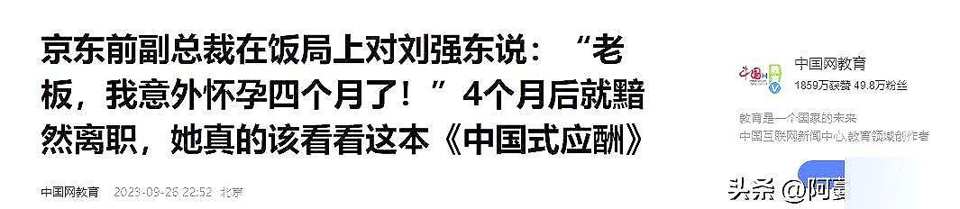(来源:中国网教育,2023-9-26《从饭桌到离职:京东前副总在刘强东面前坦白怀孕,四月后离职,若懂得《中国式应酬》或结局不同》)