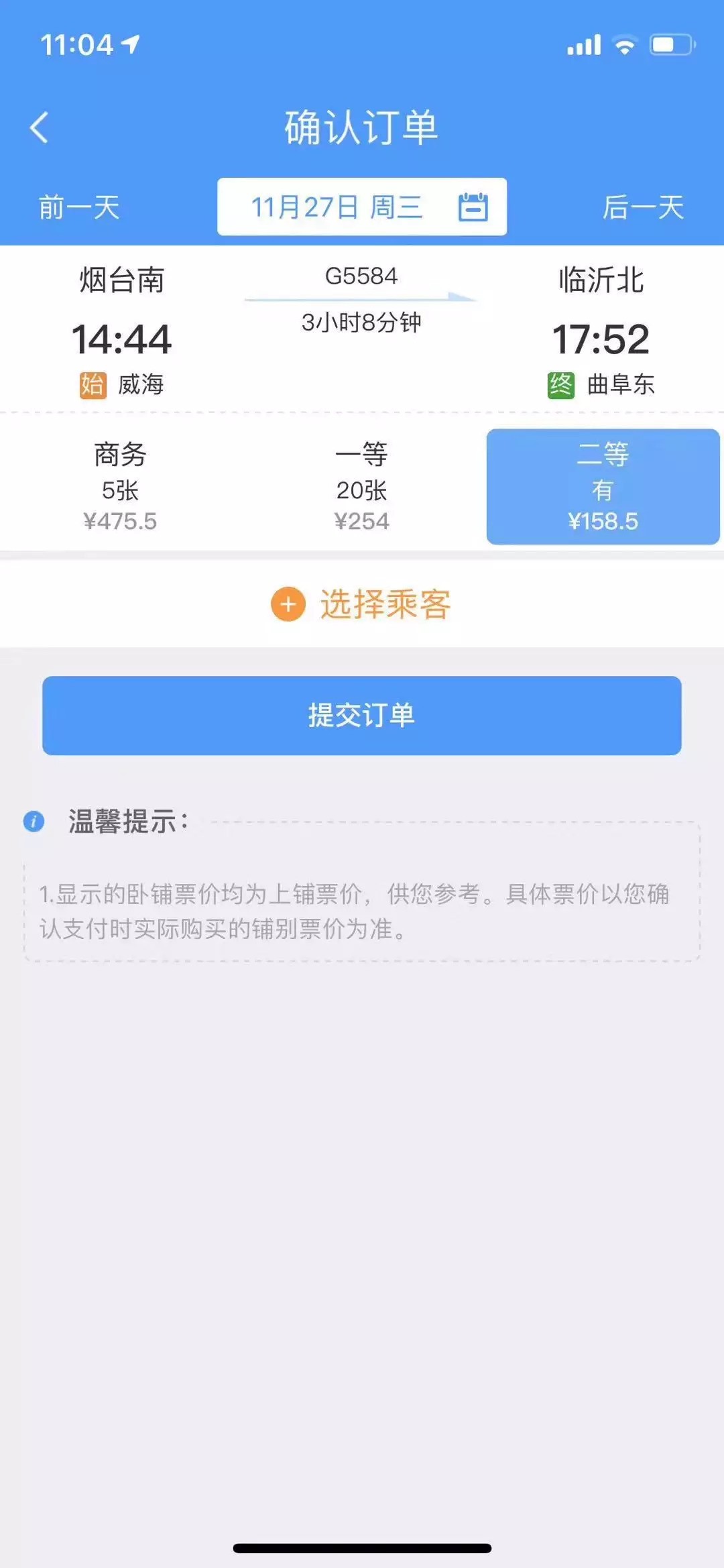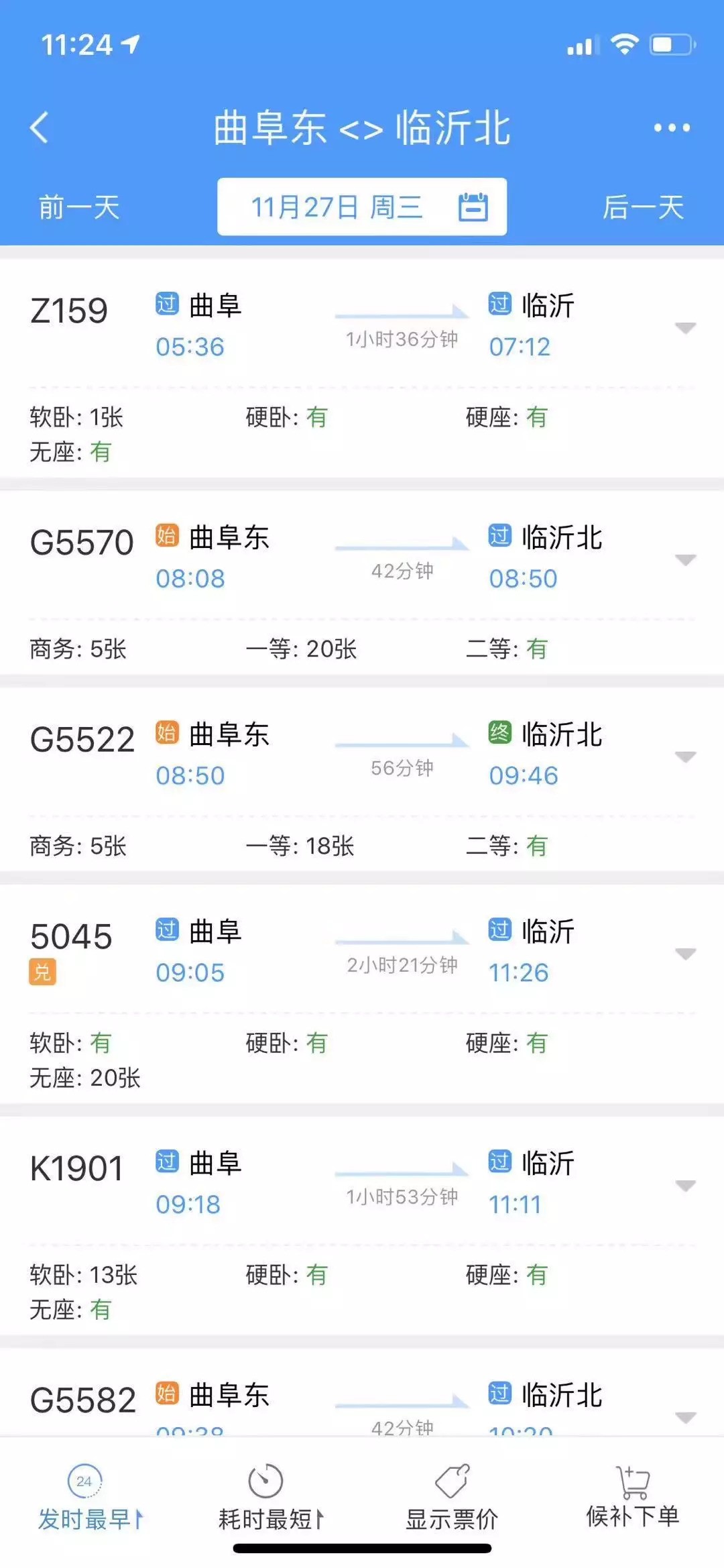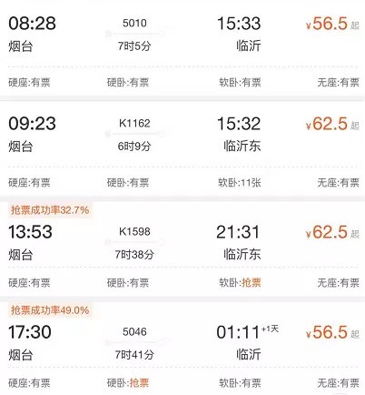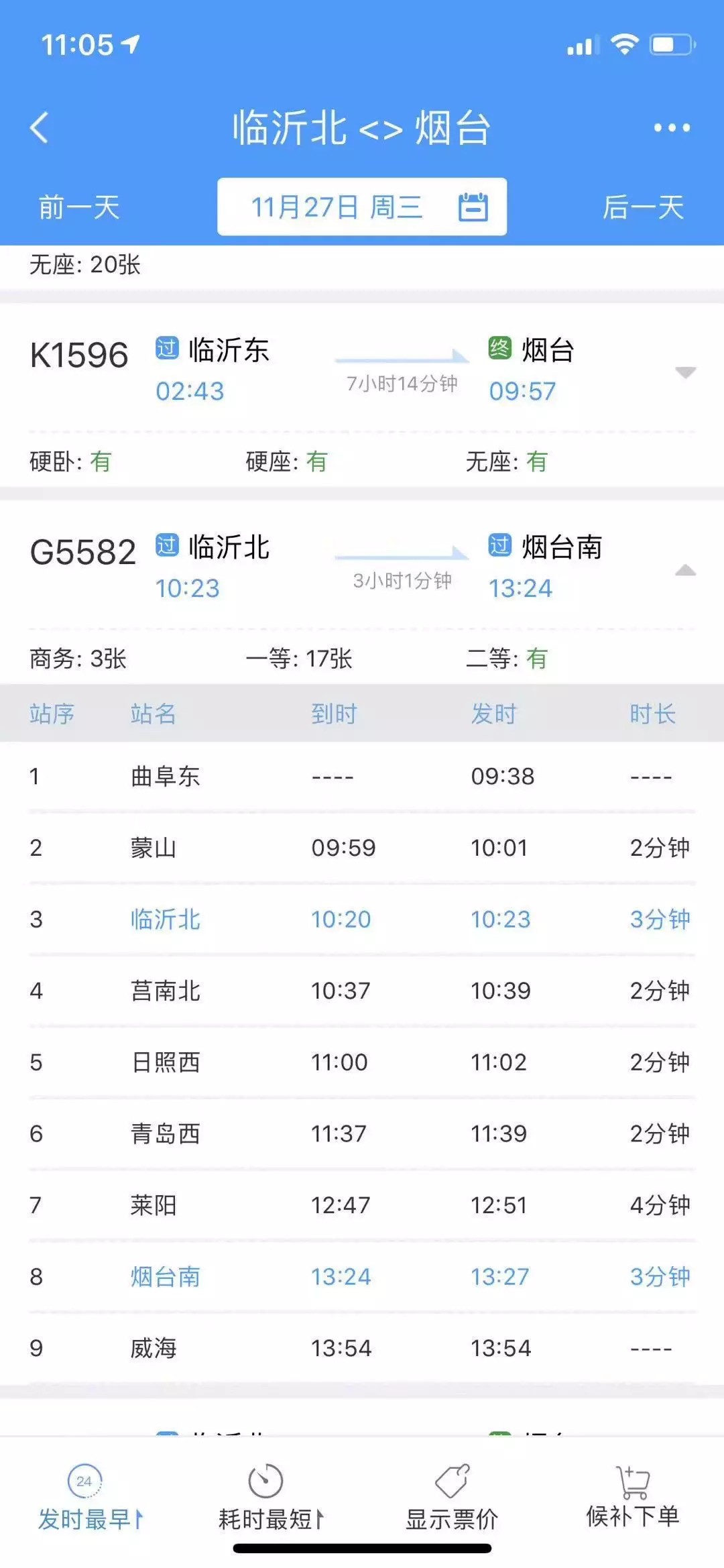 临沂北8:25分始发,沿途停靠日照西、青岛北、济南、曲阜东等11个车站,终到临沂北15:29分,全程运行7小时04分。