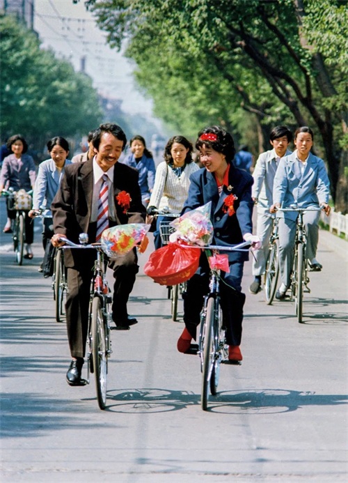 1984年,辽宁沈阳,一对骑单车的年轻夫妇。在当时,单车就像现在的私家轿车,非常流行。崔博谦 摄