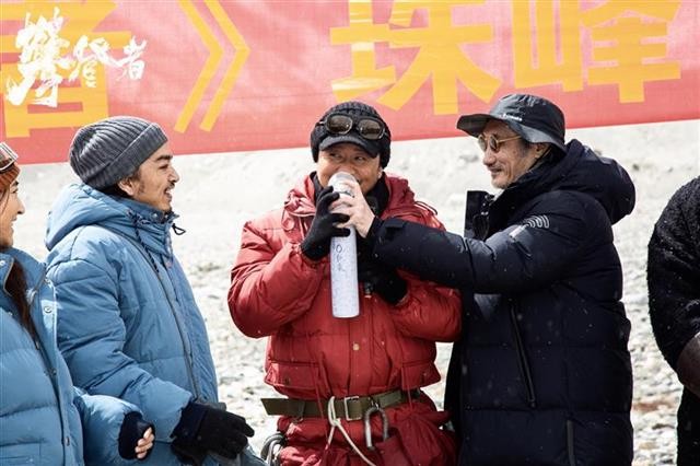 关机仪式现场,1975年胜利登顶珠峰的中国登山队队员之一的攀登英雄桑珠也专程来到活动现场,真情讲述了中国登山队勇攀珠峰的艰险过程与真实史实,并与影片主演吴京、张译、何琳、曲尼次仁、拉旺罗布,戏里戏外两代“攀登者”们一起在珠峰留下珍贵的同框合影。