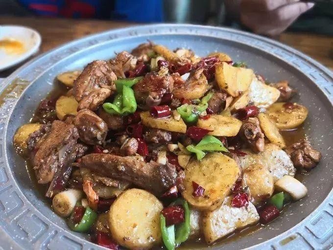 新疆最正宗的大盘鸡以当地土产公鸡配上土豆、青椒和红山椒烧制而成,口味鲜辣,吃起来酣畅淋漓。