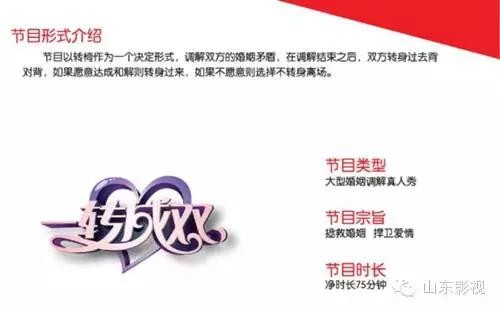 山东电视影视频道18:25点档新栏目《一转成双》,节目以转椅作为一个决定形式,调解双方的婚姻矛盾,在调解结束后,双方转身过去背对背,如果愿意达成和解则转身过来,如果不愿意则选择不转身离场。报名调解电话:0531-86107730(请在工作日时间拨打)