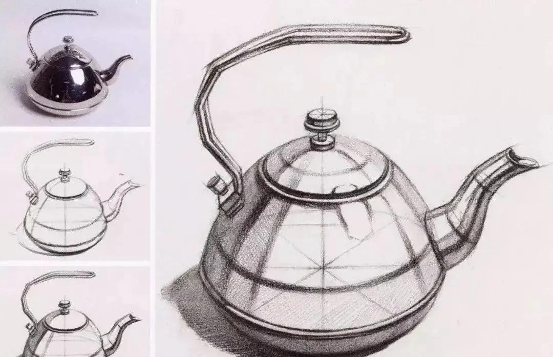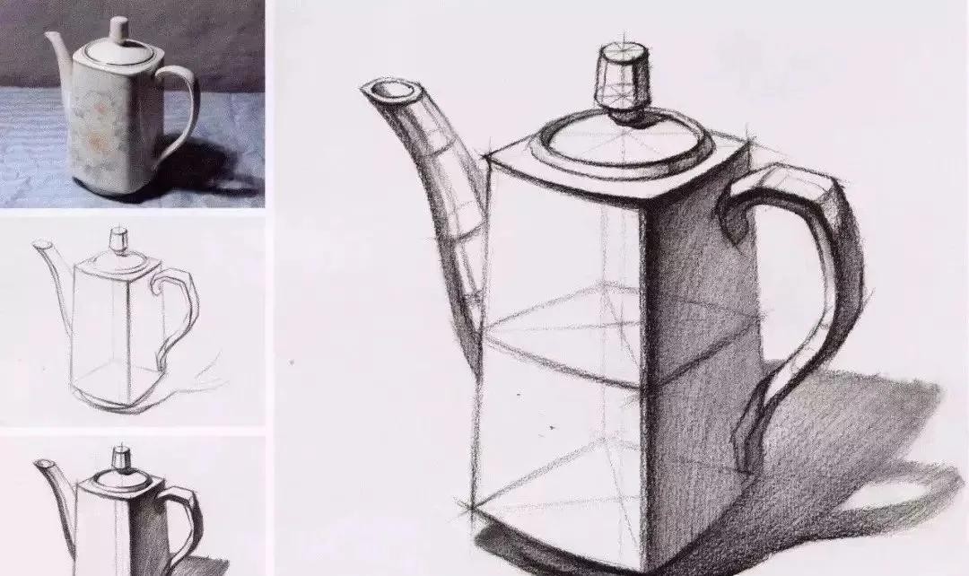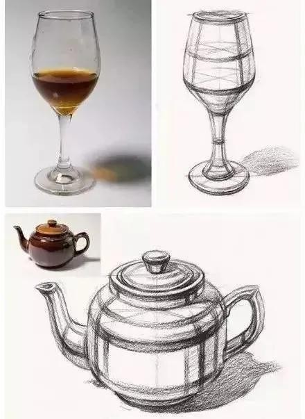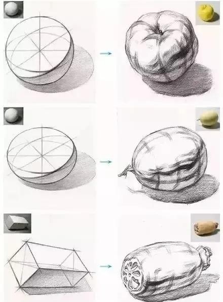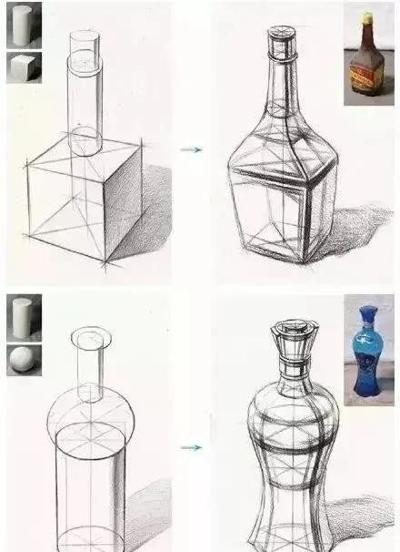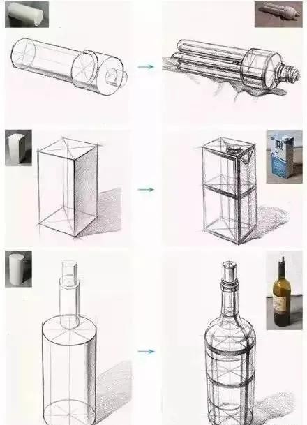 如以上图片所示,我们在初画静物结构时,可以将静物看成是单个几何体的转变或多个几何体的组合。