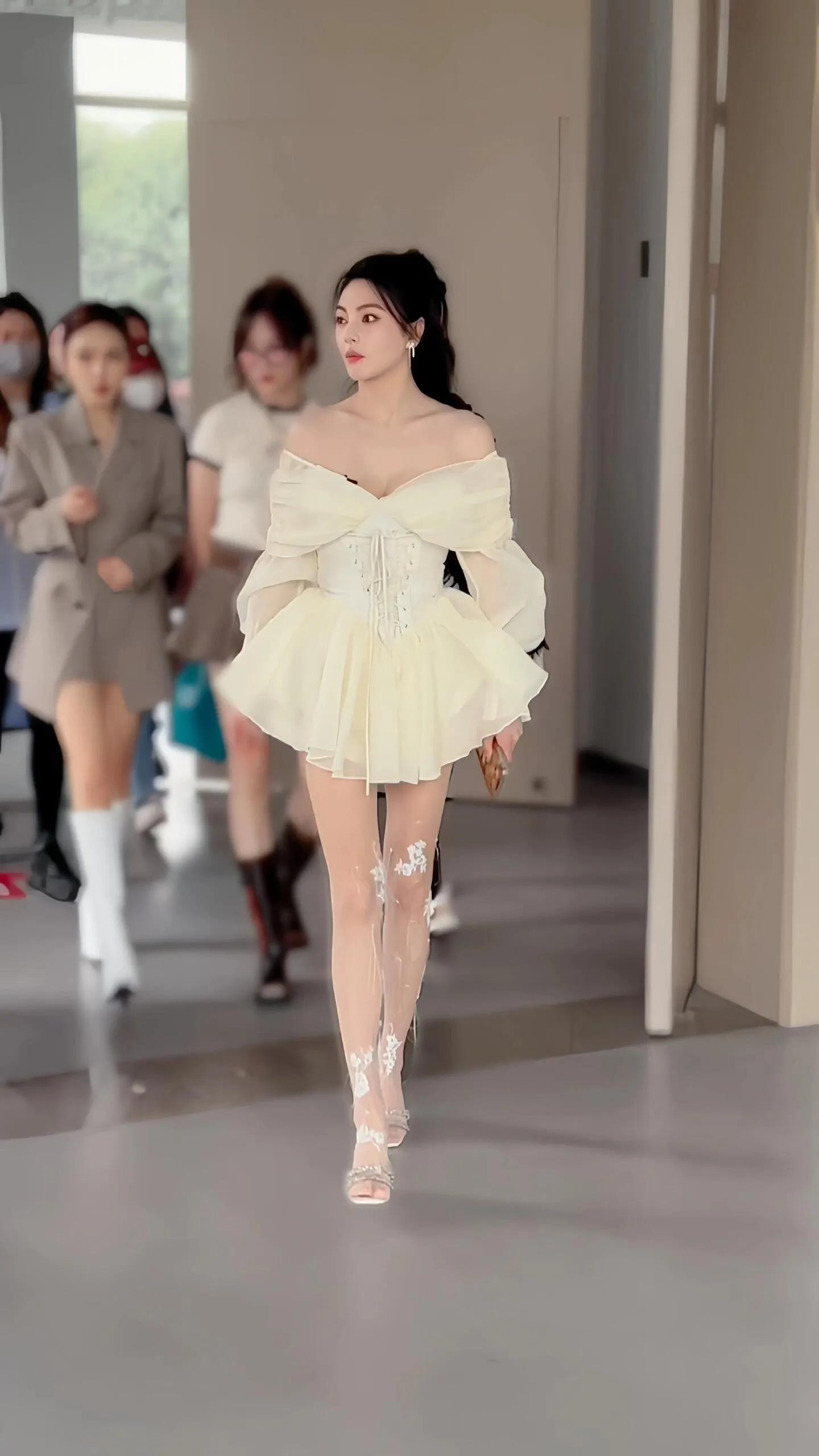 短裙长度恰好守住最后一道风景,裙摆采用扇形设计,显得腰身纤细又性感,大长腿笔直又修长,尤其是张雨绮这身超A的丝袜,太有女人味了吧!